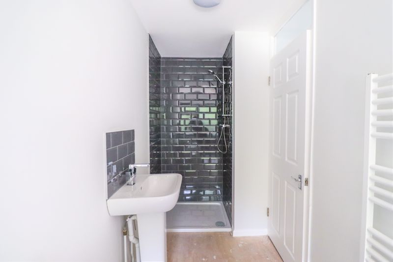 Obscure double glazed window to front aspect, panelled bath, pedestal wash hand basin, low level W/C, double shower, radiator, part tiled walls and flooring.