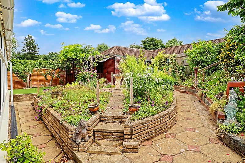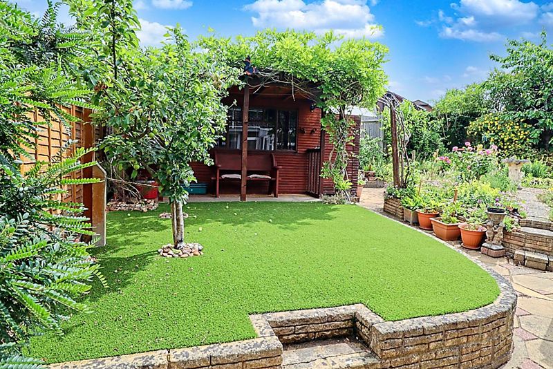 Paved seating area from property, steps up to artificial lawn area, shed to remain, tress, shrub and flower areas, additional planting areas, paved pathways to other areas of garden, gated side access.