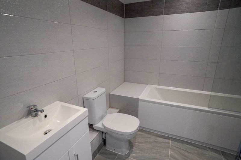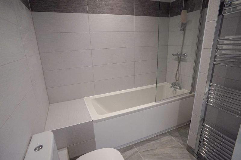 Panelled bath with mixer tap and raised shower system over, shower screen, wash hand basin in vanity unit, low level W/C, heated chrome towel rail,