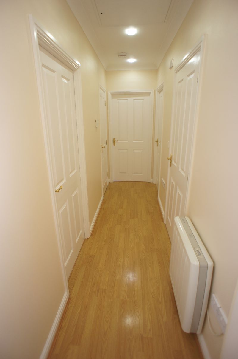 Security entry phone, two storage cupboards one housing meters, storage heaters, wood effect flooring, coving to ceiling incorporating loft access, doors leading to: